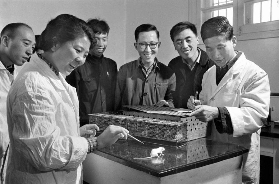 1965年9月17日,中國首次人工合成了結晶牛胰島素。圖中科學工作者正在將人工合成的產(chǎn)物注入小白鼠體內,測驗它的生物活力。新華社資料照片