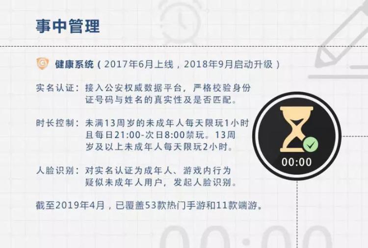 以目前體系搭建最全面的騰訊為例,2017年7月開始,以《王者榮耀》為試點,推出“健康游戲防沉迷系統(tǒng)”,限制未成年人每天登錄時長;2018年9月起,對新用戶身份信息與公安權(quán)威數(shù)據(jù)平臺進行比對,以此為標準決定是否將新用戶納入未成年人防沉迷體系……
