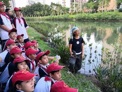 海南松鼠學(xué)堂創(chuàng)始人高高老師帶領(lǐng)海口七中的學(xué)生觀察濕地的生態(tài)環(huán)境
