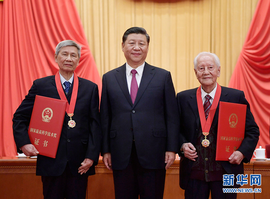 1月10日,2019年度國家科學技術(shù)獎勵大會在北京人民大會堂隆重舉行。中共中央總書記、國家主席、中央軍委主席習近平向獲得2019年度國家最高科學技術(shù)獎的原中國船舶重工集團公司第七一九研究所黃旭華院士(右)和中國科學院大氣物理研究所曾慶存院士(左)頒獎。 新華社記者 李學仁 攝