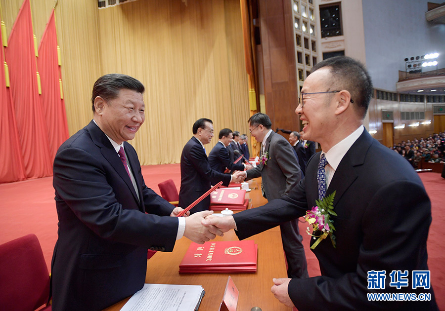 1月10日,2019年度國家科學技術(shù)獎勵大會在北京人民大會堂隆重舉行。這是中共中央總書記、國家主席、中央軍委主席習近平向獲獎代表頒發(fā)證書。 新華社發(fā)(盛佳鵬 攝)