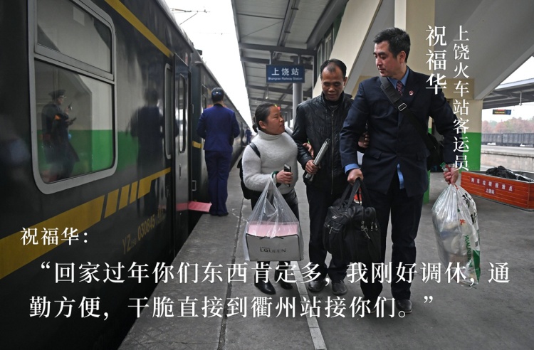 祝福華是上饒火車站的一名客運(yùn)員,經(jīng)常在車站碰到他們,每次都熱心地幫忙提行李,護(hù)送進(jìn)出站,日子久了就互相留了電話和微信以方便聯(lián)系。只要魯師傅夫婦有需要,即便沒在班上,祝福華也會(huì)趕到車站幫助他們。