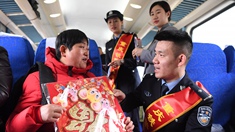 春節(jié)臨近,列車車窗上貼著窗花,車廂內(nèi)張燈結(jié)彩。為了讓老鄉(xiāng)們快樂回家,貴州團(tuán)省委組織的青年文藝志愿者與廣鐵集團(tuán)廣州客運(yùn)段動車2隊的乘務(wù)員們一起在車廂表演起豐富多彩的文藝節(jié)目。
