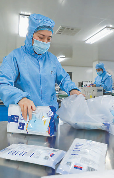 近日,各地口罩生產(chǎn)企業(yè)抓緊生產(chǎn),全力增加市場供應。圖為浙江省德清縣一家口罩企業(yè)生產(chǎn)車間,工作人員在包裝口罩。王正 王玨攝影報道(影像中國)