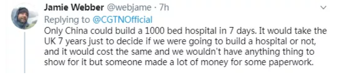 “只有中國(guó)才能在7天內(nèi)修建一個(gè)容納1000張床位的醫(yī)院了!這在英國(guó),花上7年的時(shí)間也就只夠決定到底能不能建造一個(gè)醫(yī)院.......”