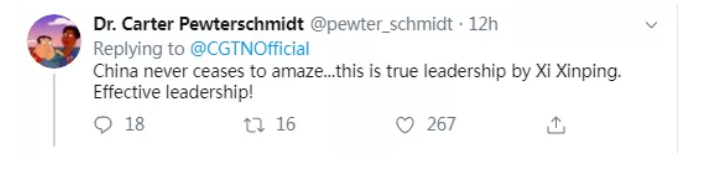 “中國(guó)從來(lái)沒(méi)有停止震驚世界,這是真正的領(lǐng)導(dǎo)力!高效的領(lǐng)導(dǎo)力!”