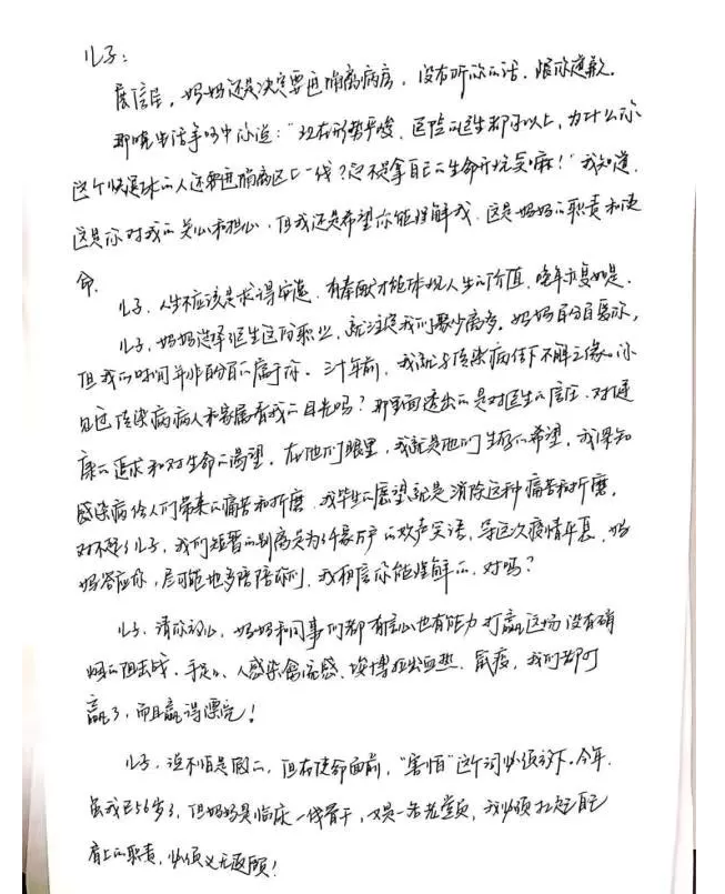 在較早收治確診病例的湖南省郴州市第二人民醫(yī)院,一封抗疫醫(yī)生的家書(shū)引人注目。家書(shū)是作為醫(yī)生的媽媽?zhuān)诩磳⑦M(jìn)入隔離病房前,寫(xiě)給帶女朋友回家過(guò)年的兒子的。