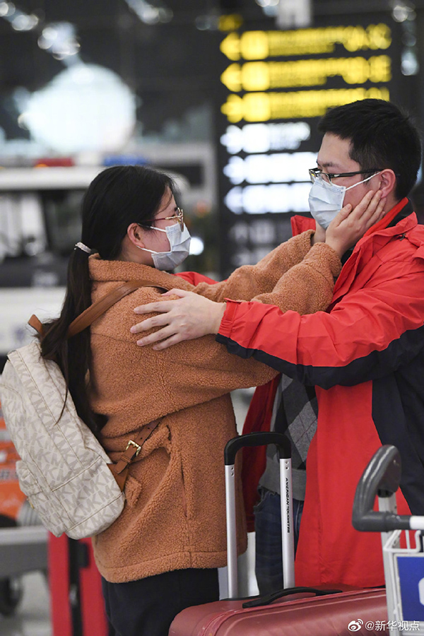 1月26日,重慶市醫(yī)療隊隊員、重慶醫(yī)科大學(xué)附屬第一醫(yī)院呼吸內(nèi)科主治醫(yī)師蔣磊同未婚妻高佳在重慶江北國際機場道別。兩人原定于2月2日領(lǐng)結(jié)婚證,但現(xiàn)在只能推遲了?!半m然我很擔(dān)心他,也很舍不得他,但我還是鼓勵他去好好工作”,高佳說,“我們現(xiàn)在計劃改在5月20日再去領(lǐng)證,我希望他加油,我等我的英雄勝利歸來”。他們的短暫離別,將換來更多人早日團聚。26日晚,130余名醫(yī)務(wù)工作者組成的重慶市醫(yī)療隊從重慶出發(fā),前往湖北省孝感市支援。(記者 王全超)