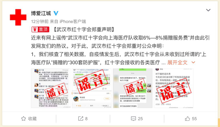 近來(lái)有網(wǎng)上謠傳“武漢市紅十字會(huì)向上海醫(yī)療隊(duì)收取6%—8%捐贈(zèng)服務(wù)費(fèi)”并由此引發(fā)網(wǎng)友們的熱議。對(duì)于此,武漢市紅十字會(huì)鄭重對(duì)公眾申明: