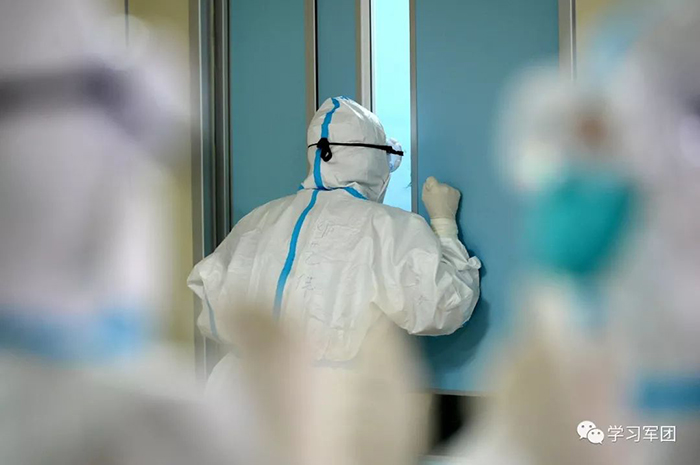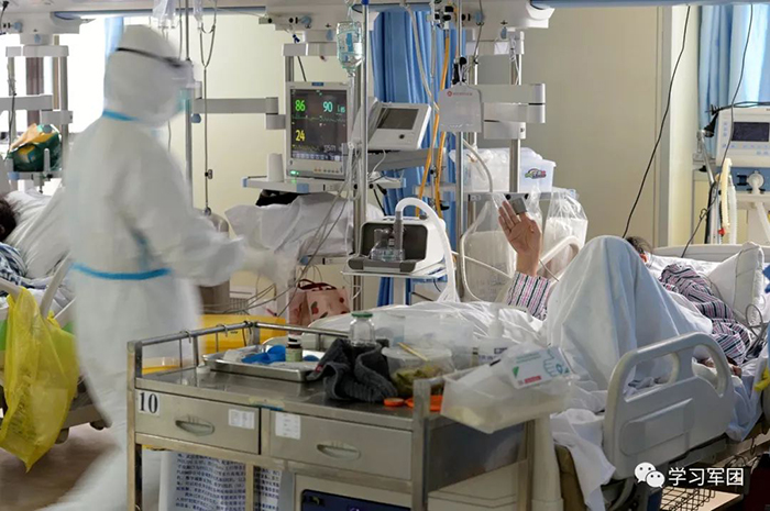1月27日上午,海軍軍醫(yī)大學(xué)醫(yī)療隊(duì)醫(yī)護(hù)人員在漢口醫(yī)院重癥監(jiān)護(hù)室對(duì)新型冠狀病毒感染的肺炎患者進(jìn)行救治。醫(yī)護(hù)人員與監(jiān)護(hù)室外人員隔門交流。解放軍報(bào)記者范顯海攝