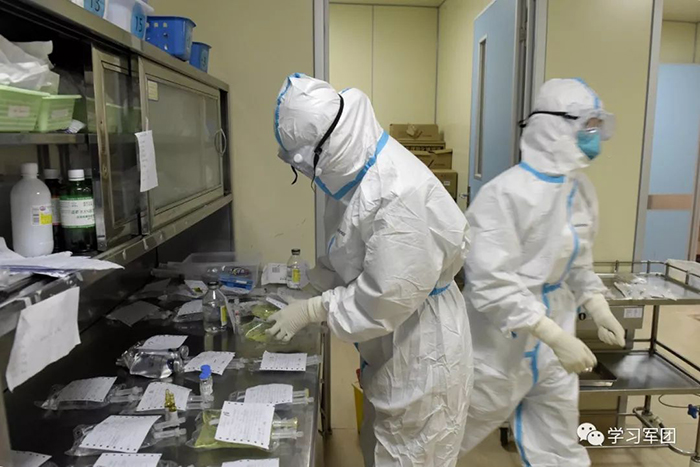 1月27日上午,海軍軍醫(yī)大學(xué)醫(yī)療隊(duì)醫(yī)護(hù)人員在漢口醫(yī)院重癥監(jiān)護(hù)室對(duì)新型冠狀病毒感染的肺炎患者進(jìn)行救治。醫(yī)護(hù)人員為患者做液體治療準(zhǔn)備。解放軍報(bào)記者范顯海攝