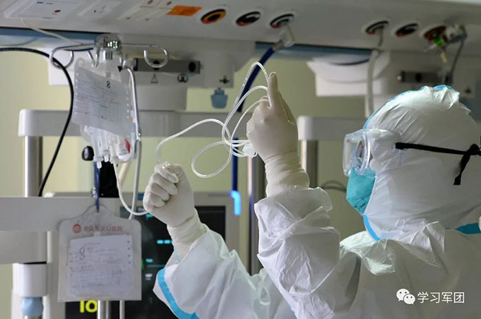 1月27日上午,海軍軍醫(yī)大學(xué)醫(yī)療隊(duì)醫(yī)護(hù)人員在漢口醫(yī)院重癥監(jiān)護(hù)室對(duì)新型冠狀病毒感染的肺炎患者進(jìn)行救治。醫(yī)護(hù)人員對(duì)患者進(jìn)行輸液護(hù)理。解放軍報(bào)記者范顯海攝