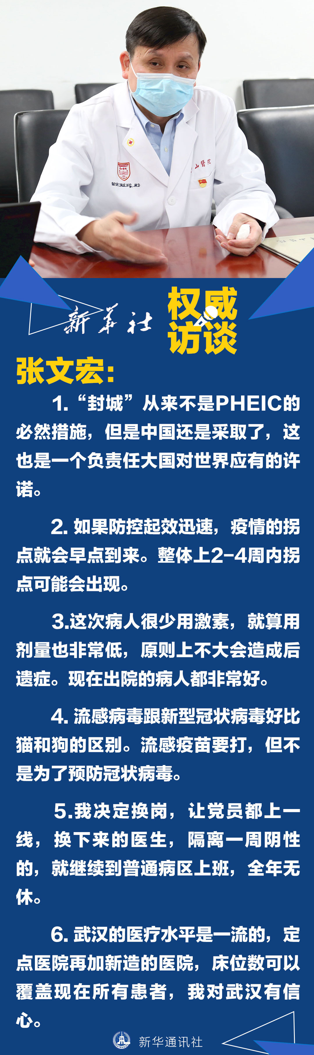 近日,上海醫(yī)療救治專(zhuān)家組組長(zhǎng)、復(fù)旦大學(xué)附屬華山醫(yī)院感染科主任張文宏面對(duì)記者采訪說(shuō)的這些話,使他成為網(wǎng)民心中的“硬核”醫(yī)生。1月31日,張文宏在接受新華社記者的專(zhuān)訪時(shí)表示,疫情來(lái)了,堅(jiān)守崗位是醫(yī)生的職責(zé)所在。