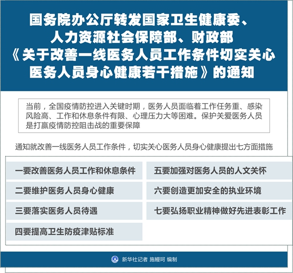 通知就改善一線醫(yī)務(wù)人員工作條件,切實(shí)關(guān)心醫(yī)務(wù)人員身心健康提出七方面措施。一要改善醫(yī)務(wù)人員工作和休息條件。加強(qiáng)醫(yī)務(wù)人員職業(yè)暴露的防護(hù)設(shè)施建設(shè)和設(shè)備配置,重點(diǎn)改造醫(yī)生辦公室、值班室和休息室。為醫(yī)務(wù)人員提供良好后勤服務(wù),保障醫(yī)務(wù)人員充足的睡眠和飲食。二要維護(hù)醫(yī)務(wù)人員身心健康。合理安排醫(yī)務(wù)人員作息時(shí)間。對于因執(zhí)行疫情防控不能休假的醫(yī)務(wù)人員,在防控任務(wù)結(jié)束后,由所在醫(yī)療衛(wèi)生機(jī)構(gòu)優(yōu)先安排補(bǔ)休。允許需要緊急補(bǔ)充醫(yī)護(hù)人員等疫情防控工作人員的相關(guān)醫(yī)療衛(wèi)生機(jī)構(gòu)簡化招聘程序。加強(qiáng)醫(yī)務(wù)人員個(gè)人防護(hù),組織做好一線醫(yī)務(wù)人員健康體檢,最大限度減少院內(nèi)感染。加強(qiáng)心理危機(jī)干預(yù)和心理疏導(dǎo),減輕醫(yī)務(wù)人員心理壓力。三要落實(shí)醫(yī)務(wù)人員待遇。為疫情防控一線醫(yī)務(wù)人員和防疫工作者發(fā)放臨時(shí)性工作補(bǔ)助。向防控任務(wù)重、風(fēng)險(xiǎn)程度高的醫(yī)療衛(wèi)生機(jī)構(gòu)核增不納入基數(shù)的一次性績效工資總量。開通醫(yī)務(wù)人員工傷認(rèn)定綠色通道。四要提高衛(wèi)生防疫津貼標(biāo)準(zhǔn)。出臺(tái)提高衛(wèi)生防疫津貼標(biāo)準(zhǔn)的政策。對參與新冠肺炎疫情防疫人員,要及時(shí)足額發(fā)放到位。五要加強(qiáng)對醫(yī)務(wù)人員的人文關(guān)懷。動(dòng)員組織社會(huì)力量,對一線醫(yī)務(wù)人員展開慰問。為一線醫(yī)務(wù)人員和家屬建立溝通聯(lián)絡(luò)渠道。對家庭困難的一線醫(yī)務(wù)人員家屬進(jìn)行對口幫扶。六要?jiǎng)?chuàng)造更加安全的執(zhí)業(yè)環(huán)境。嚴(yán)格落實(shí)各項(xiàng)安全防范措施,加大警力投入,完善問責(zé)機(jī)制,對發(fā)現(xiàn)有歧視孤立一線醫(yī)務(wù)人員及其家屬行為的,要及時(shí)進(jìn)行批評教育,情節(jié)嚴(yán)重的依法予以處理。對傷害醫(yī)務(wù)人員的,要堅(jiān)決依法嚴(yán)肅查處。七要弘揚(yáng)職業(yè)精神做好先進(jìn)表彰工作。做好及時(shí)獎(jiǎng)勵(lì)和及時(shí)性表彰工作,為做好疫情防控工作增強(qiáng)信心、凝聚力量。