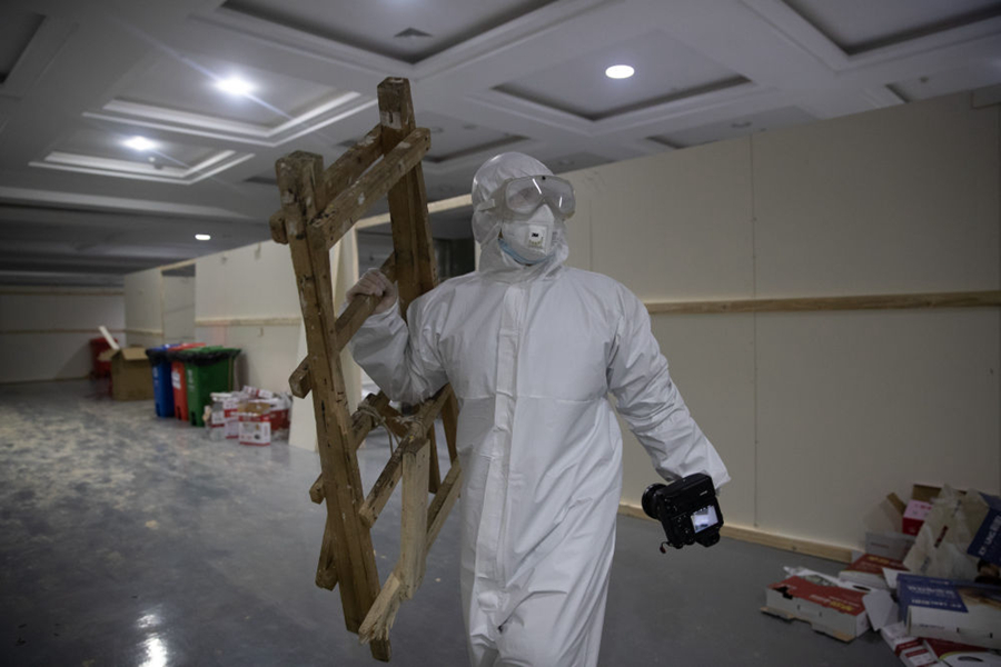 這些身影中還有被隔離的病人。江漢方艙醫(yī)院啟用的第一天,收治的首批病人里,有一個(gè)面目清秀的小伙子。入院躺下后,他打開了一本《政治秩序的起源》,安靜地閱讀??谡终谧×怂谋砬?,但卻藏不住眼神里的平靜和專注??匆娢遗e起相機(jī),他輕輕擺了擺手,示意不用拍他,我猶豫片刻,還是執(zhí)意按下了快門。也許他并不明白,在有些喧囂的方艙醫(yī)院里,近乎靜止的他,是多么的令人震撼。