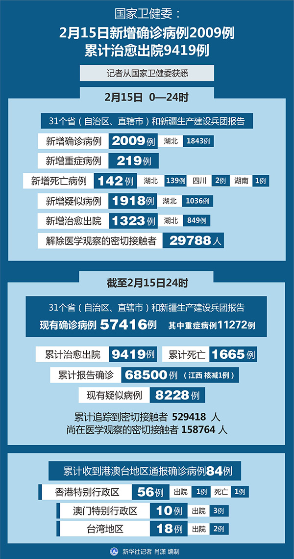 截至2月15日24時,據(jù)31個?。ㄗ灾螀^(qū)、直轄市)和新疆生產(chǎn)建設兵團報告,現(xiàn)有確診病例57416例(其中重癥病例11272例),累計治愈出院病例9419例,累計死亡病例1665例,累計報告確診病例68500例(江西省核減1例),現(xiàn)有疑似病例8228例。累計追蹤到密切接觸者529418人,尚在醫(yī)學觀察的密切接觸者158764人。