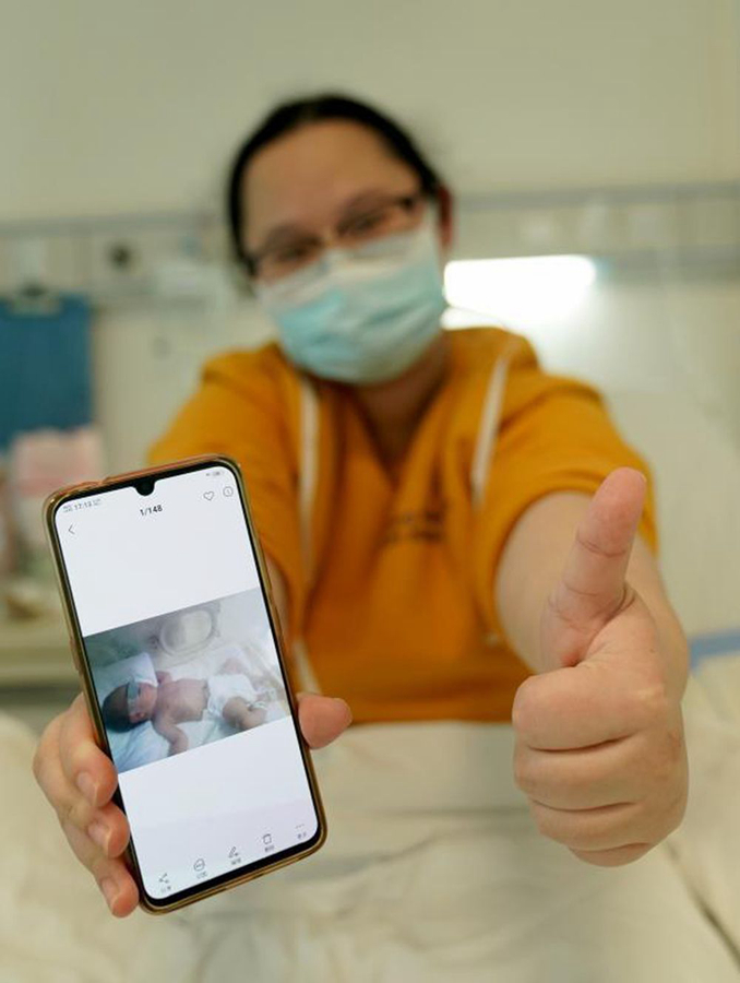 2月18日,楊女士展示手機中自己兒子的照片。在武漢華中科技大學同濟醫(yī)院中法新城院區(qū)新冠肺炎重癥病區(qū)住院的楊女士是武漢人,在身患新冠肺炎后剖腹產(chǎn)下一名男嬰。嬰兒目前在醫(yī)院進行隔離觀察,但各項指標均正常。當楊女士知道孩子的情況后,懸著的心終于放下。在醫(yī)護人員的努力下,她的病情也有了好轉(zhuǎn)。新華社記者王毓國 攝