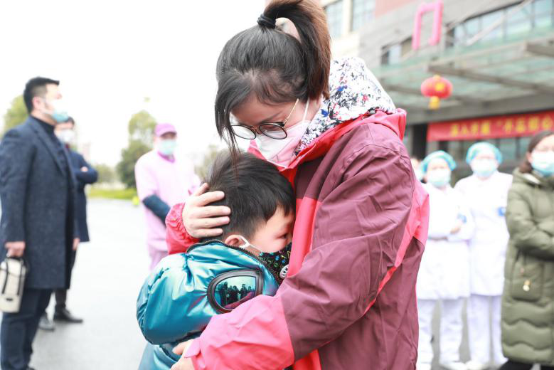 孫曉蘭緊緊摟住前來(lái)送行的兒子。江蘇南京醫(yī)科大學(xué)附屬逸夫醫(yī)院供圖