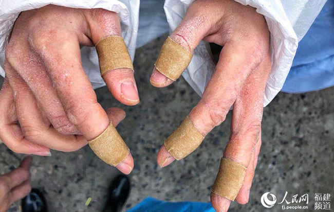 “我每天只能通過(guò)視頻和媽媽聊天。”謝小燕每天早出晚歸,母子倆很難見(jiàn)上一面。曾元博說(shuō),因?yàn)閶寢屆刻焐舷掳喽家M(jìn)行嚴(yán)格消毒,雙手已經(jīng)被干裂出一道道血口?!皨寢尩氖忠呀?jīng)干裂得不成樣子了,一使勁就會(huì)流血,真讓我們心疼?!?/p>