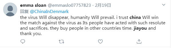 推特用戶emma sloan說:病毒將會消失,人類將會獲勝。我相信中國將會打敗病毒,因為中國人民采取了堅決且富有犧牲精神的行動。他們給其他國家的人民爭取了時間。加油,謝謝你們。