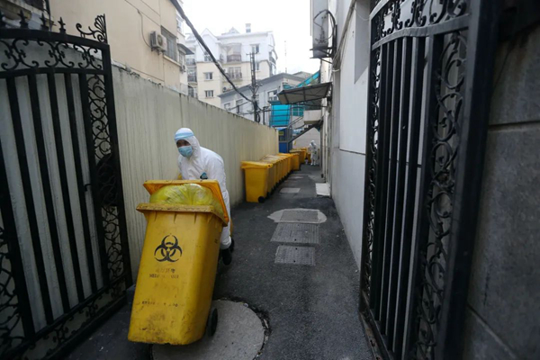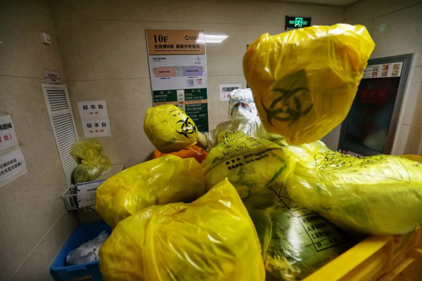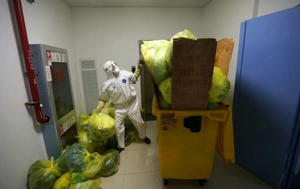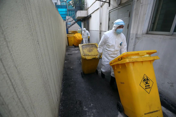 但是醫(yī)療廢棄物產(chǎn)生的速度實(shí)在太快,一線醫(yī)務(wù)工作者用完的防護(hù)服、口罩、鞋套……病人的生活垃圾,病人的餐余垃圾,病人的嘔吐物等等感染性廢棄物都要快速處理,醫(yī)療廢棄物產(chǎn)生的速度已超過(guò)了后勤部門正常的處理速度。周師傅介紹稱,ICU中的保潔員會(huì)將感染性醫(yī)療廢棄物集中放在指定處理間的黃色垃圾桶中,然后他們有四位師傅每天早上六點(diǎn)到下午五點(diǎn)會(huì)在整個(gè)院區(qū)不停地轉(zhuǎn)運(yùn)黃色垃圾桶,然后還會(huì)安排專人值班,晚上只要接到院內(nèi)科室電話就會(huì)趕過(guò)去把黃色垃圾桶運(yùn)出來(lái),他們已經(jīng)保證24小時(shí)隨時(shí)有人在崗負(fù)責(zé)處理醫(yī)療廢棄物了,“我們不拼命不行啊,這是人命關(guān)天的事。”周師傅稱。