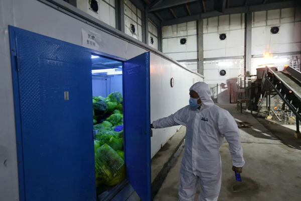 雷神山醫(yī)院醫(yī)用垃圾裂解焚燒車間的暫存?zhèn)}庫(kù)里,配有24小時(shí)紫外線照射消毒。(攝影:崔萌)