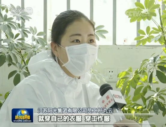江蘇陽光集團(tuán)有限公司員工 杭九云:完全不一樣,我們平時干活的話,就穿自己的工作服,穿廠服就好了,現(xiàn)在來了,要穿這個密不透風(fēng),我感覺醫(yī)生還要比我們不容易,他們還要去救人,其實(shí)他們比我們還要更累,所以堅(jiān)持吧。