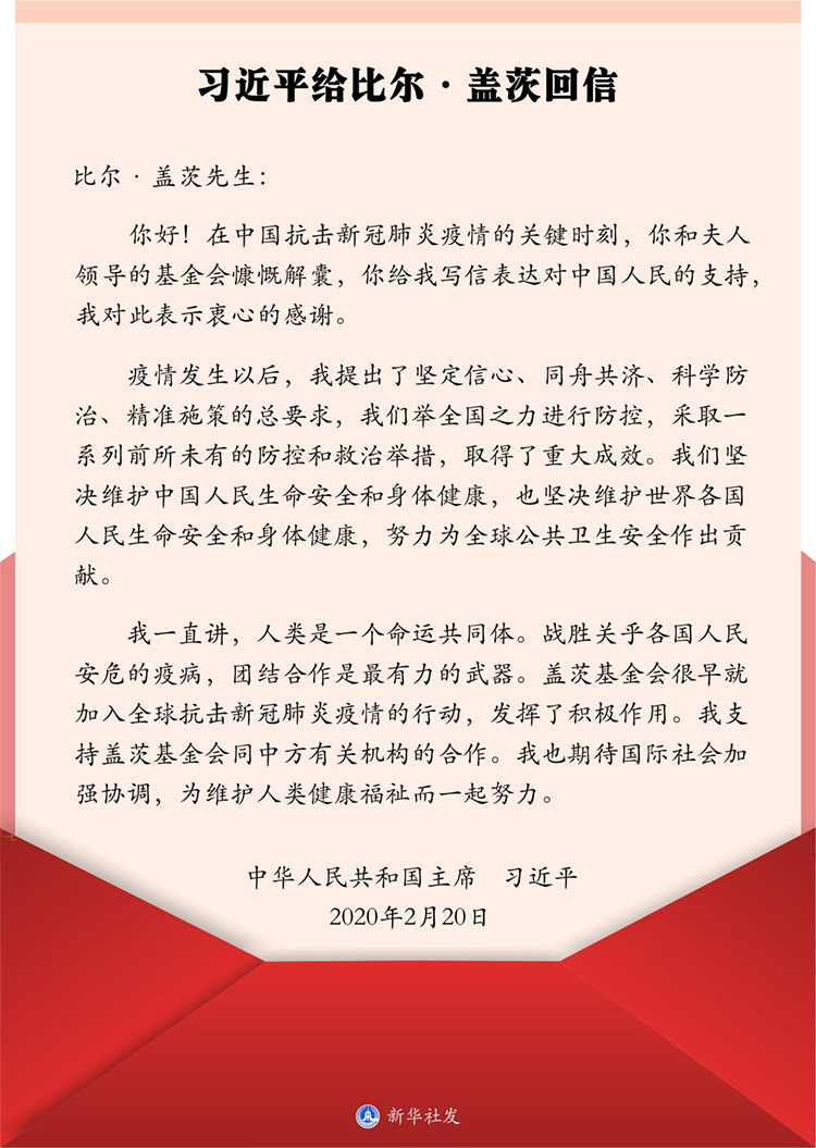 2月20日,在給美國蓋茨基金會聯(lián)席主席比爾·蓋茨的回信中,習近平主席這樣寫道。