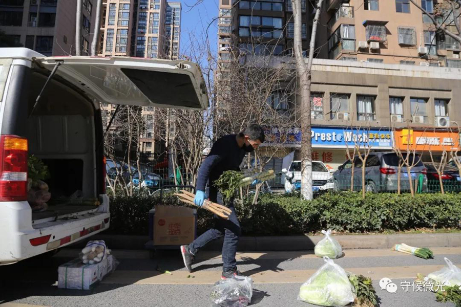 2月16日,湖北省武漢市,送菜小哥許可在為取單的小區(qū)居民擺放貨品。中國青年報(bào) 趙迪/攝