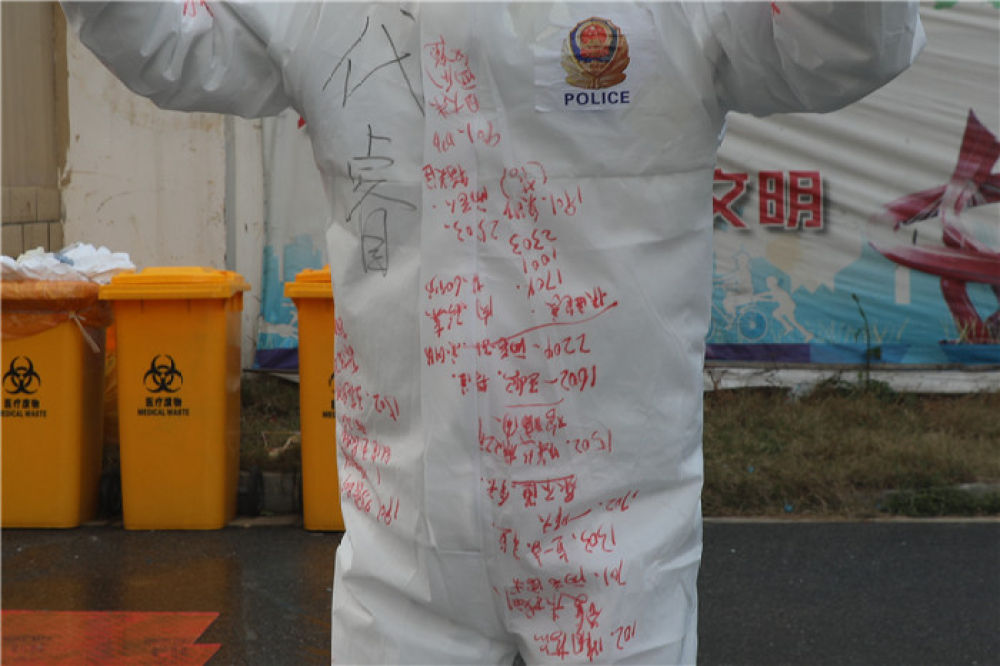 用紅色簽字筆寫在防護(hù)服上醒目的位置