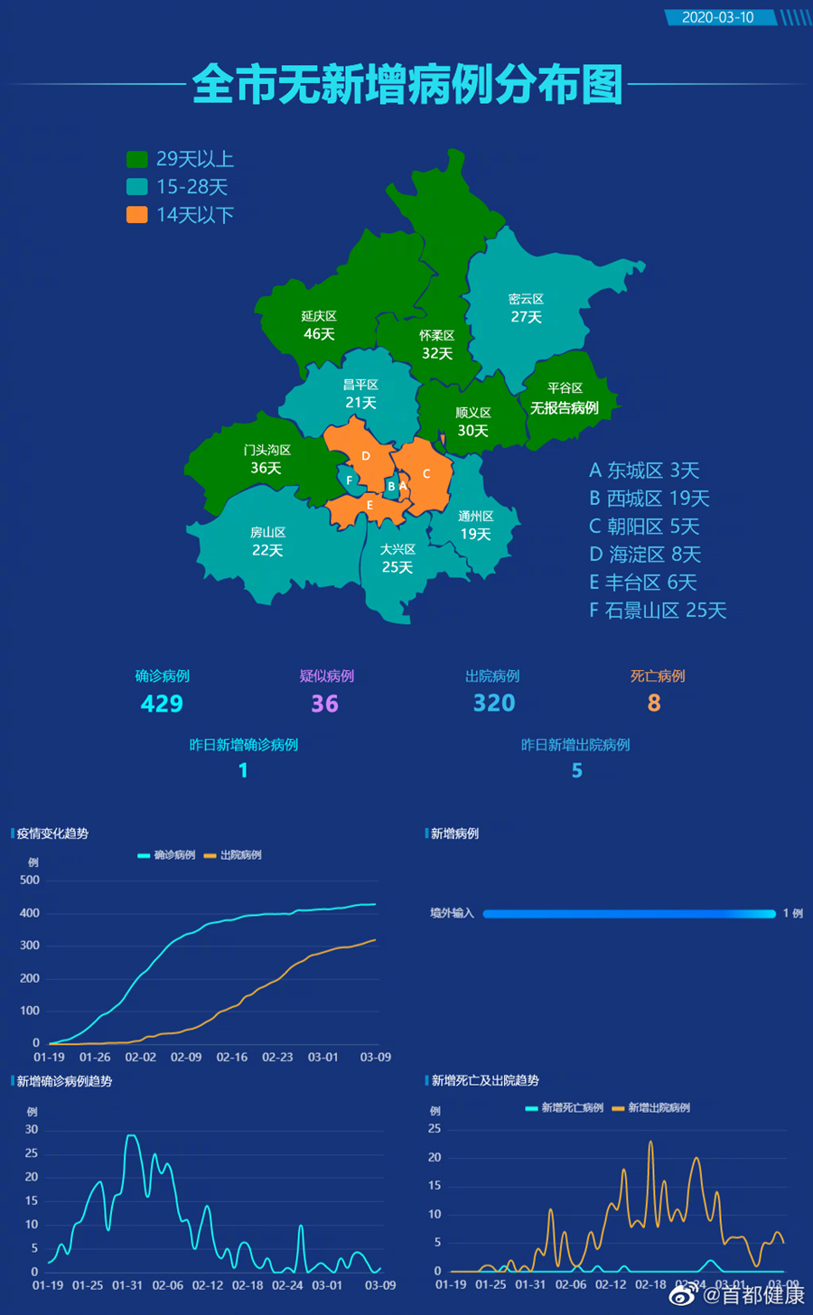 截至3月9日24時(shí),累計(jì)確診病例429例,治愈出院病例320例,死亡病例8例?,F(xiàn)有疑似病例36例。累計(jì)確定密切接觸者3650人,其中467人尚在隔離醫(yī)學(xué)觀察中。確診病例中東城區(qū)14例、西城區(qū)53例、朝陽區(qū)72例、海淀區(qū)63例、豐臺(tái)區(qū)43例、石景山區(qū)14例、門頭溝3例、房山區(qū)16例、通州區(qū)19例、順義區(qū)10例、昌平區(qū)29例、大興區(qū)39例、懷柔區(qū)7例、密云區(qū)7例、延慶區(qū)1例,平谷區(qū)尚未有病例,外地來京病例25例,境外輸入病例14例。
