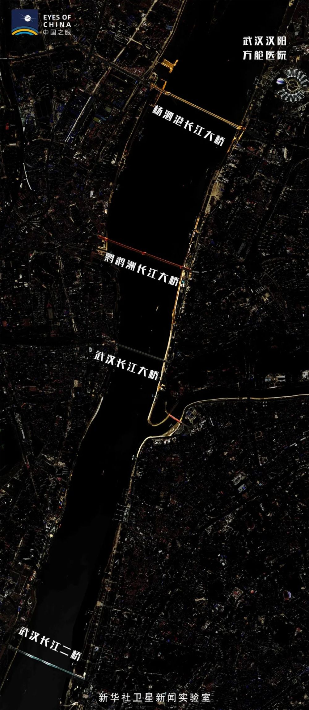 除了江漢區(qū)、硚口區(qū)、江岸區(qū)等核心城區(qū)的燈光一定程度變暗外,天河機場、武漢火車站、漢口火車站、武昌火車站等城市交通樞紐站依舊燈光閃耀,連接武漢三鎮(zhèn)的交通路網(wǎng)散發(fā)的路燈光串起了這座城市的運行脈絡(luò),10天建成的火神山燈光由一片暗變成一片亮。