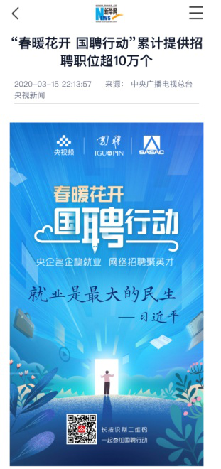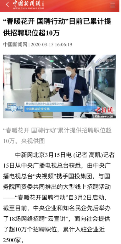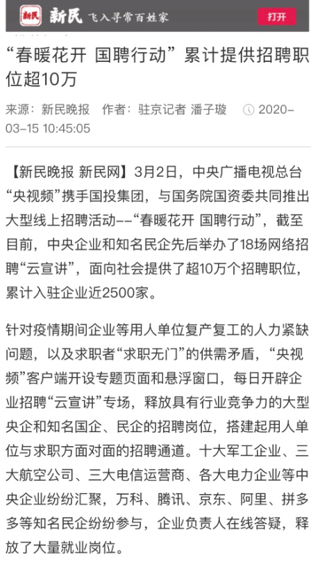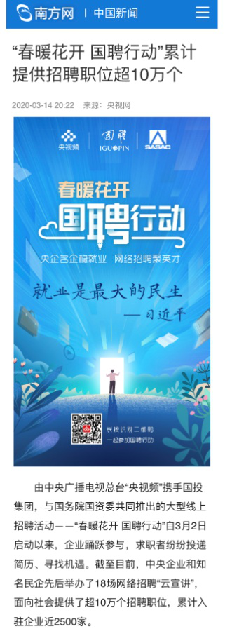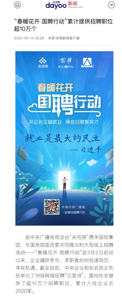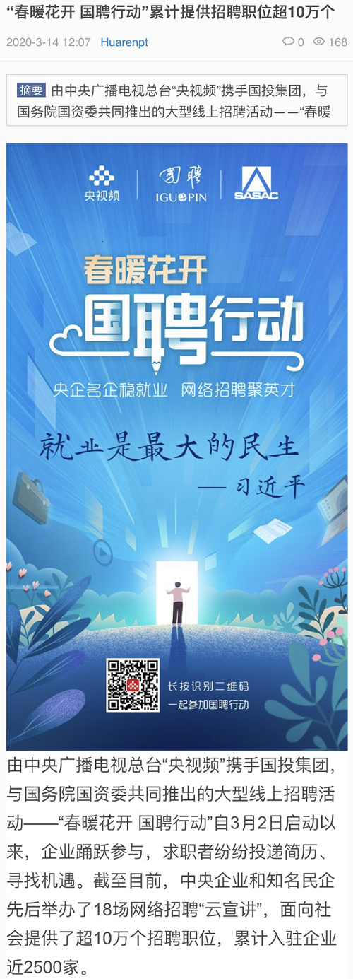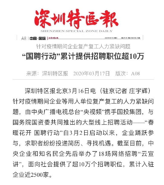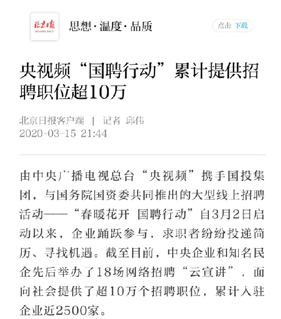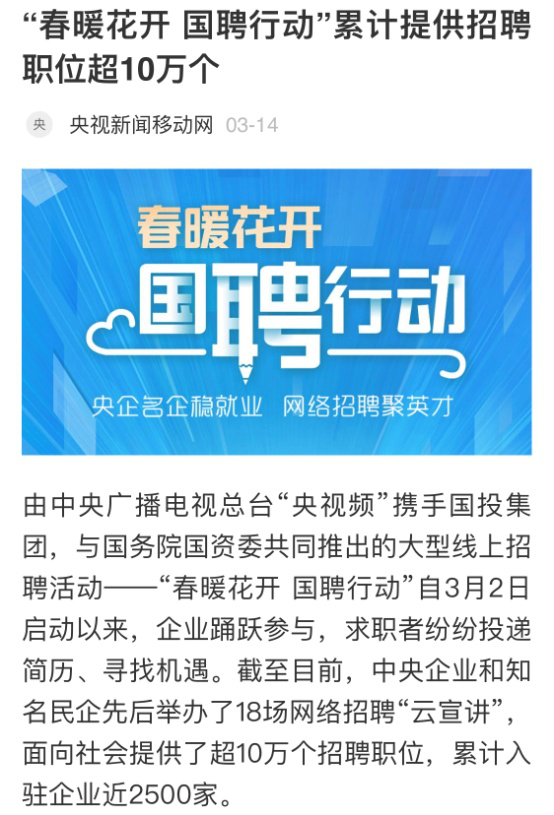 由中央廣播電視總臺“央視頻”攜手國投集團(tuán),與國務(wù)院國資委共同推出的大型線上招聘活動——“春暖花開 國聘行動”,自3月2日啟動以來,企業(yè)踴躍參與,求職者紛紛投遞簡歷。截至3月14日已面向社會提供了超10萬個招聘職位,累計入駐企業(yè)近2500家,引發(fā)眾多媒體和網(wǎng)站轉(zhuǎn)載報道。