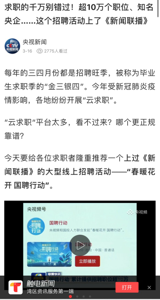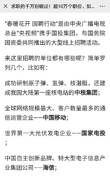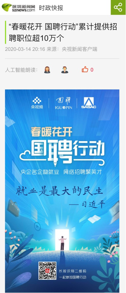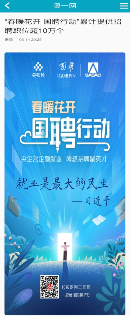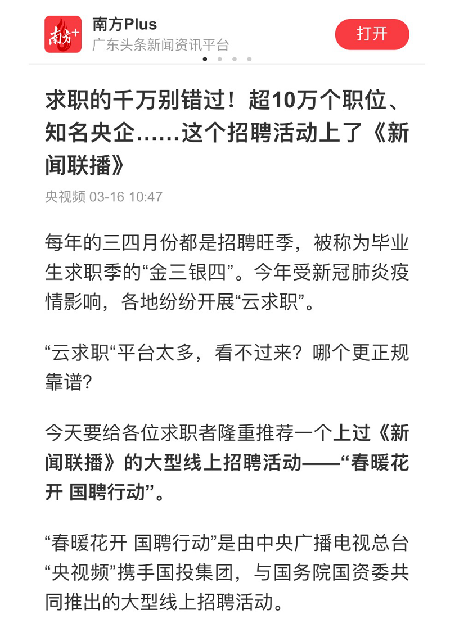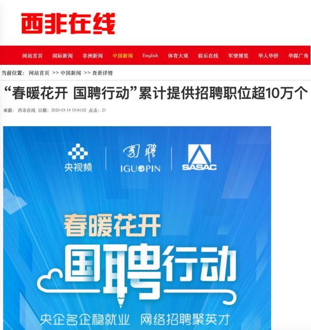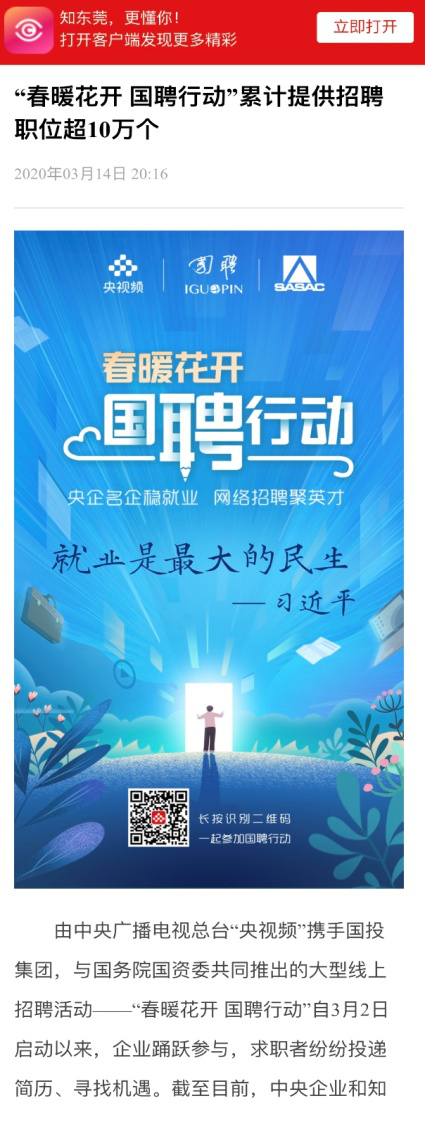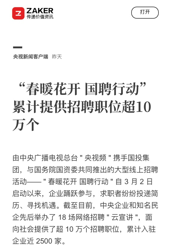 由中央廣播電視總臺“央視頻”攜手國投集團(tuán),與國務(wù)院國資委共同推出的大型線上招聘活動——“春暖花開 國聘行動”,自3月2日啟動以來,企業(yè)踴躍參與,求職者紛紛投遞簡歷。截至3月14日已面向社會提供了超10萬個招聘職位,累計入駐企業(yè)近2500家,引發(fā)眾多媒體和網(wǎng)站轉(zhuǎn)載報道。