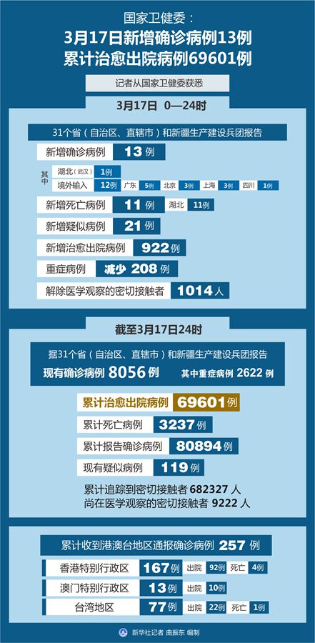 截至3月17日24時(shí),據(jù)31個(gè)省(自治區(qū)、直轄市)和新疆生產(chǎn)建設(shè)兵團(tuán)報(bào)告,現(xiàn)有確診病例8056例(其中重癥病例2622例),累計(jì)治愈出院病例69601例,累計(jì)死亡病例3237例,累計(jì)報(bào)告確診病例80894例,現(xiàn)有疑似病例119例。累計(jì)追蹤到密切接觸者682327人,尚在醫(yī)學(xué)觀察的密切接觸者9222人。
