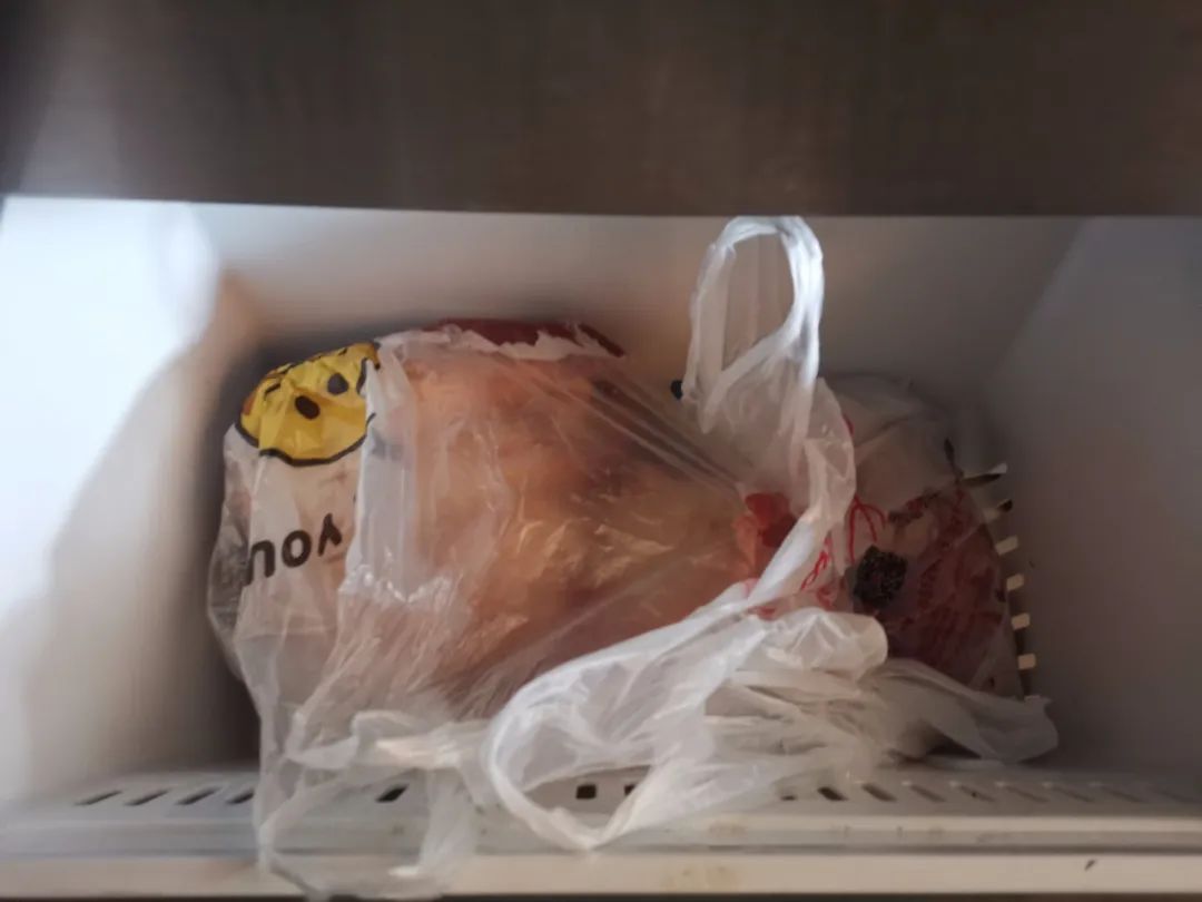 獨(dú)居老人任德康的冰箱里滿滿的肉和菜