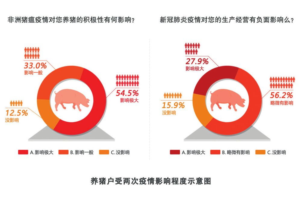 調(diào)查顯示,54.5%的養(yǎng)豬戶認(rèn)為非洲豬瘟疫情對養(yǎng)豬的積極性影響極大,防護(hù)成本高、造成虧損、仔豬成本高,是養(yǎng)豬戶反映非洲豬瘟疫情帶來的最強(qiáng)烈影響,27.9%的養(yǎng)豬戶認(rèn)為新冠肺炎疫情對生產(chǎn)經(jīng)營的負(fù)面影響極大。(見圖1)