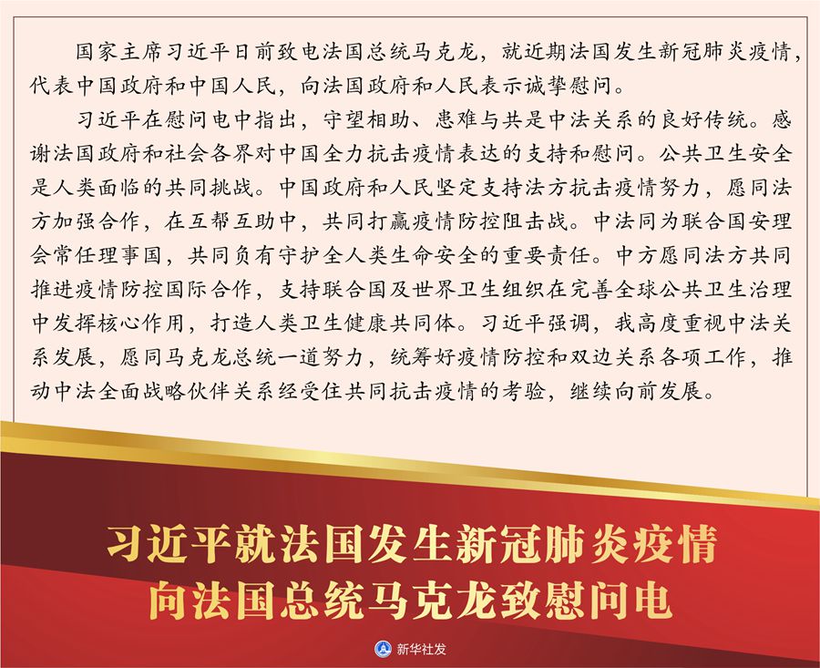 習近平在慰問電中指出,守望相助、患難與共是中法關(guān)系的良好傳統(tǒng)。感謝法國政府和社會各界對中國全力抗擊疫情表達的支持和慰問。公共衛(wèi)生安全是人類面臨的共同挑戰(zhàn)。中國政府和人民堅定支持法方抗擊疫情努力,愿同法方加強合作,在互幫互助中,共同打贏疫情防控阻擊戰(zhàn)。中法同為聯(lián)合國安理會常任理事國,共同負有守護全人類生命安全的重要責任。中方愿同法方共同推進疫情防控國際合作,支持聯(lián)合國及世界衛(wèi)生組織在完善全球公共衛(wèi)生治理中發(fā)揮核心作用,打造人類衛(wèi)生健康共同體。習近平強調(diào),我高度重視中法關(guān)系發(fā)展,愿同馬克龍總統(tǒng)一道努力,統(tǒng)籌好疫情防控和雙邊關(guān)系各項工作,推動中法全面戰(zhàn)略伙伴關(guān)系經(jīng)受住共同抗擊疫情的考驗,繼續(xù)向前發(fā)展。