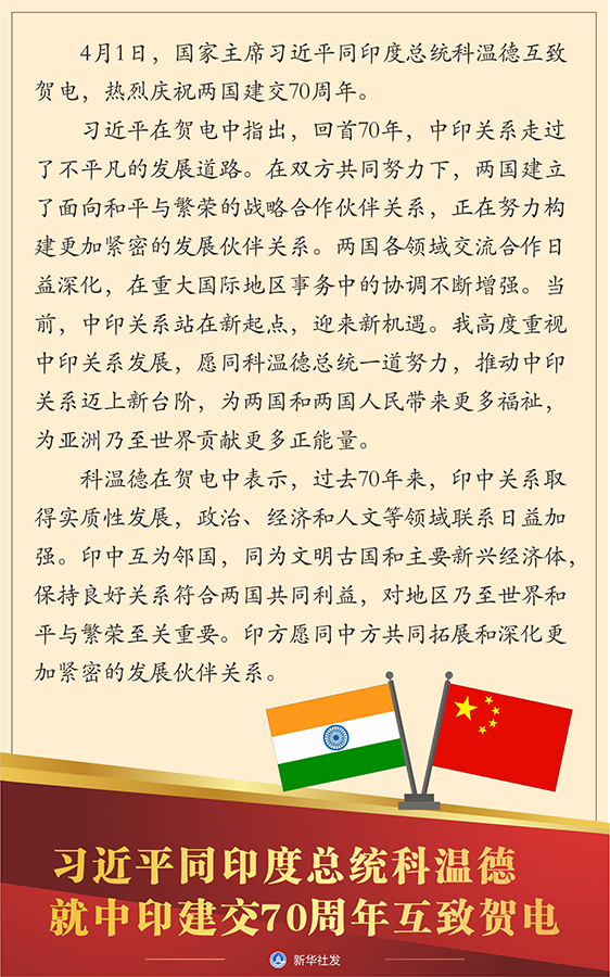 新華社北京4月1日電 4月1日,國家主席習近平同印度總統(tǒng)科溫德互致賀電,熱烈慶祝兩國建交70周年。