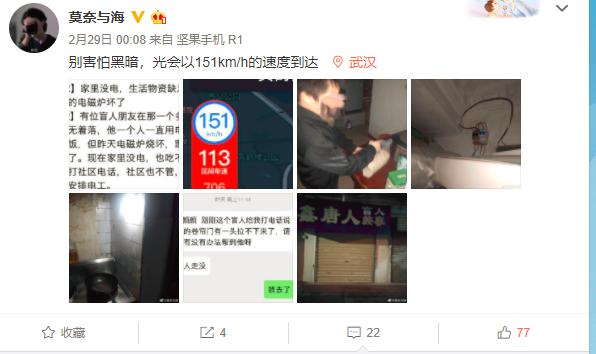 2月28日晚上10點多,樓威辰收到一項特殊的求助。一個獨居盲人張磊(化名)因電磁爐燒壞導致跳閘停電,無法做飯,打電話給社區(qū),社區(qū)說暫時沒法安排電工,只好通過朋友在網(wǎng)上求助。