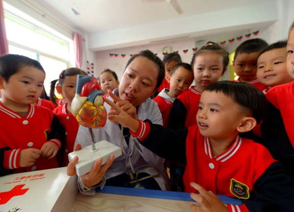 醫(yī)護人員講授關(guān)于心臟的常識,教育孩子們珍愛生命王曉攝
