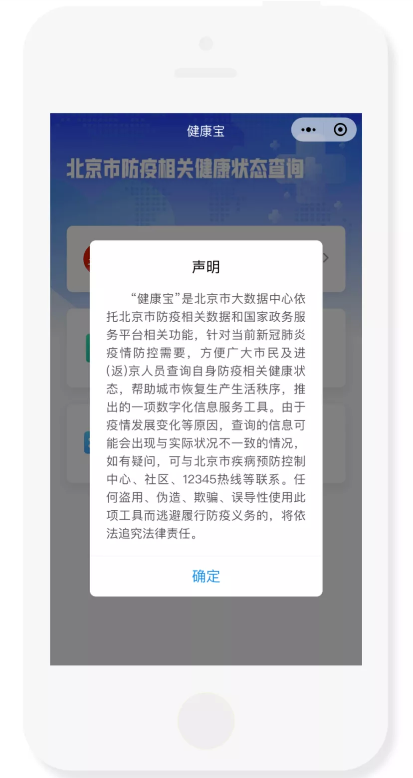 “健康寶”是北京市大數(shù)據(jù)中心依托北京市防疫相關數(shù)據(jù)和國家政務服務平臺相關功能,針對當前新冠肺炎疫情防控需要,方便廣大市民及進(返)京人員查詢自身防疫相關健康狀態(tài),幫助城市恢復生產(chǎn)生活秩序,推出的一項數(shù)字化信息服務工具。