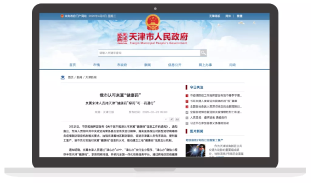 京冀來津人員通過“津心辦”APP、“津心辦”支付寶小程序、“津心辦”微信小程序申領天津“健康碼”,享受同城待遇,并依托全國一體化政務服務平臺,通過跨地區(qū)防疫健康信息數(shù)據(jù)共享,實現(xiàn)京津冀“健康碼”信息互認,生成天津“健康碼”,憑碼出行。