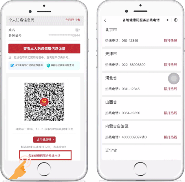 現(xiàn)在,在防疫信息碼的亮碼頁增加了“各地健康碼服務熱線電話”,用戶可通過服務熱線咨詢健康碼使用問題。