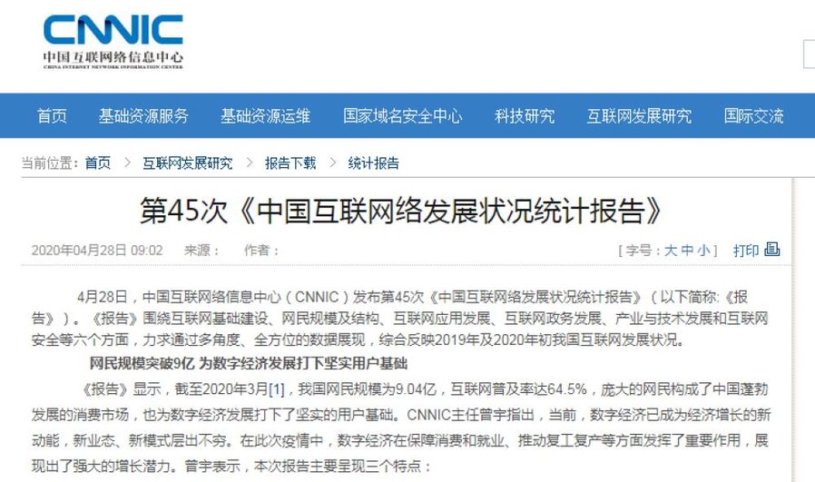 4月28日,中國互聯(lián)網(wǎng)絡(luò)信息中心(CNNIC)發(fā)布第45次《中國互聯(lián)網(wǎng)絡(luò)發(fā)展?fàn)顩r統(tǒng)計報告》(以下簡稱:《報告》)?!秷蟾妗穱@互聯(lián)網(wǎng)基礎(chǔ)建設(shè)、網(wǎng)民規(guī)模及結(jié)構(gòu)、互聯(lián)網(wǎng)應(yīng)用發(fā)展、互聯(lián)網(wǎng)政務(wù)發(fā)展、產(chǎn)業(yè)與技術(shù)發(fā)展和互聯(lián)網(wǎng)安全等六個方面,力求通過多角度、全方位的數(shù)據(jù)展現(xiàn),綜合反映2019年及2020年初我國互聯(lián)網(wǎng)發(fā)展?fàn)顩r。