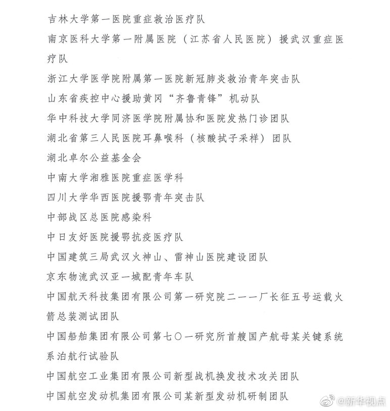 榮獲“中國青年五四獎章集體”的分別是:北汽福田國慶70周年群眾游行彩車底盤制作和技術保障團隊,天津飛騰嵌入式CPU研發(fā)團隊,河北醫(yī)科大學第一醫(yī)院“先心病”愛心團隊,太鋼集團不銹鋼“手撕鋼”創(chuàng)新研發(fā)團隊,哈爾濱工業(yè)大學紫丁香學生微納衛(wèi)星團隊,諸暨市公安局楓橋派出所,科大訊飛認知智能國家重點實驗室創(chuàng)新團隊,南昌大學“稻漁工程”團隊,濰柴青年科技創(chuàng)新團隊,中國散裂中子源建設團隊,中國航發(fā)渦輪院某發(fā)動機研制團隊,甘肅省無償捐獻遺體器官志愿服務隊,清華大學研究生支教團青海湟中分隊,73022部隊56分隊,新一代精打體系武器系統(tǒng)青年創(chuàng)新團隊,北京大學援鄂抗疫醫(yī)療隊,中國醫(yī)科大學新冠肺炎疫情防控醫(yī)療總隊,吉林大學第一醫(yī)院重癥救治醫(yī)療隊,南京醫(yī)科大學第一附屬醫(yī)院(江蘇省人民醫(yī)院)援武漢重癥醫(yī)療隊,浙江大學醫(yī)學院附屬第一醫(yī)院新冠肺炎救治青年突擊隊,山東省疾控中心援助黃岡“齊魯青鋒”機動隊,華中科技大學同濟醫(yī)學院附屬協(xié)和醫(yī)院發(fā)熱門診團隊,湖北省第三人民醫(yī)院耳鼻喉科(核酸拭子采樣)團隊,湖北卓爾公益基金會,中南大學湘雅醫(yī)院重癥醫(yī)學科,四川大學華西醫(yī)院援鄂青年突擊隊,中部戰(zhàn)區(qū)總醫(yī)院感染科,中日友好醫(yī)院援鄂抗疫醫(yī)療隊,中國建筑三局武漢火神山、雷神山醫(yī)院建設團隊,京東物流武漢亞一城配青年車隊,中國航天科技集團有限公司第一研究院二一一廠長征五號運載火箭總裝測試團隊,中國船舶集團有限公司第七〇一研究所首艘國產(chǎn)航母某關鍵系統(tǒng)系泊航行試驗隊,中國航空工業(yè)集團有限公司新型戰(zhàn)機換發(fā)技術攻關團隊,中國航空發(fā)動機集團有限公司某新型發(fā)動機研制團隊。