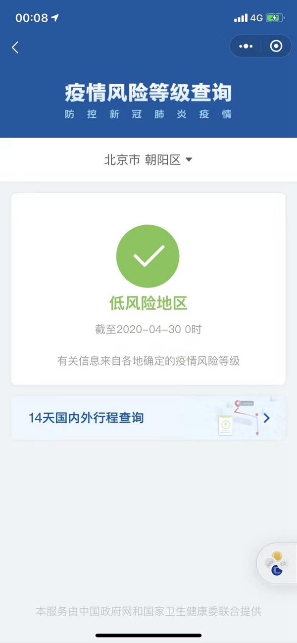 4月30日,疫情風(fēng)險(xiǎn)等級(jí)查詢系統(tǒng)顯示,北京朝陽區(qū)降為低風(fēng)險(xiǎn)地區(qū)。此前,朝陽區(qū)為全國唯一高風(fēng)險(xiǎn)地區(qū)。4月29日 ,北京市宣布4月30日起公共衛(wèi)生應(yīng)急響應(yīng)級(jí)別由一級(jí)降至二級(jí)。(李金磊)