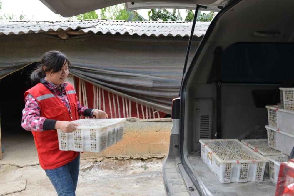 廣西百色市德??h敬德鎮(zhèn)馱信村駐村第一書記李梅在裝運(yùn)即將出售的鵪鶉蛋(資料照片)。新華社發(fā)