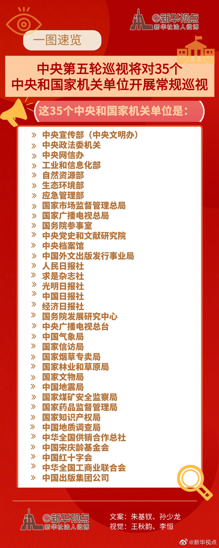 新華社北京5月9日電 經(jīng)黨中央批準(zhǔn),十九屆中央第五輪巡視將對中央宣傳部(中央文明辦)、中央政法委機(jī)關(guān)、中央網(wǎng)信辦、工業(yè)和信息化部、自然資源部、生態(tài)環(huán)境部、應(yīng)急管理部、國家市場監(jiān)督管理總局、國家廣播電視總局、國務(wù)院參事室、中央黨史和文獻(xiàn)研究院、中央檔案館、中國外文出版發(fā)行事業(yè)局、人民日報社、求是雜志社、光明日報社、中國日報社、經(jīng)濟(jì)日報社、國務(wù)院發(fā)展研究中心、中央廣播電視總臺、中國氣象局、國家信訪局、國家煙草專賣局、國家林業(yè)和草原局、國家文物局、中國地震局、國家煤礦安全監(jiān)察局、國家藥品監(jiān)督管理局、國家知識產(chǎn)權(quán)局、中國地質(zhì)調(diào)查局、中華全國供銷合作總社、中國宋慶齡基金會、中國紅十字會、中華全國工商業(yè)聯(lián)合會、中國出版集團(tuán)公司等35個中央和國家機(jī)關(guān)單位黨組織開展常規(guī)巡視。