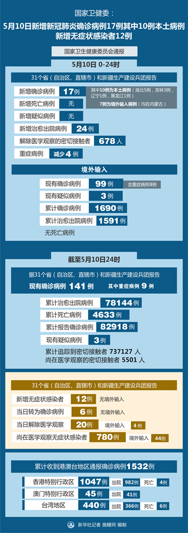 截至5月10日24時,據(jù)31個?。ㄗ灾螀^(qū)、直轄市)和新疆生產(chǎn)建設(shè)兵團報告,現(xiàn)有確診病例141例(其中重癥病例9例),累計治愈出院病例78144例,累計死亡病例4633例,累計報告確診病例82918例,現(xiàn)有疑似病例3例。累計追蹤到密切接觸者737127人,尚在醫(yī)學(xué)觀察的密切接觸者5501人。